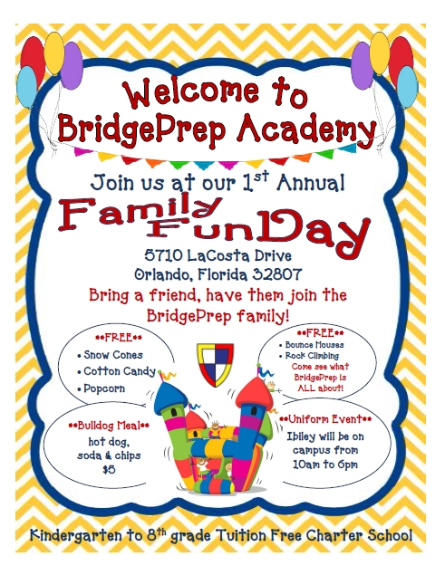Join usSaturday, August 6th10am to 6pm**Uniform Event****Bulldog Meals****Snacks****Bounce Houses and Rock Climbing**Bring a friend, have them join you at BridgePrep Academy!
